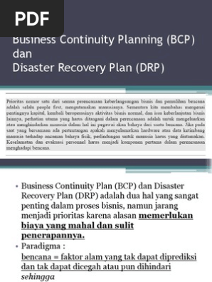 The goal of these plans is to prevent business operations from stopping. Dalam bahasa lain bcp adalah rencana bagaimana suatu organisasi bertahan dalam menghadapi. Business continuity plan bcp dan disaster recovery plan drp adalah dua hal yang sangat penting dalam proses bisnis namun jarang menjadi prioritas karena alasan memerlukan biaya yang mahal dan sulit penerapannya.